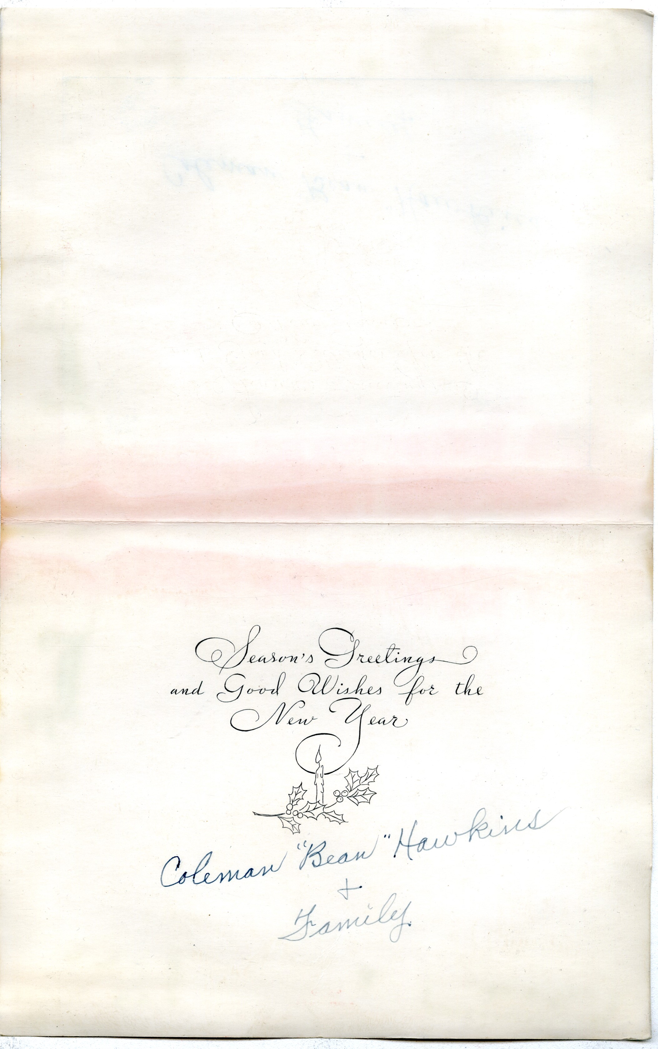 Christmas card to Roy Eldridge, signed by saxophonist Coleman "Bean" Hawkins and Family